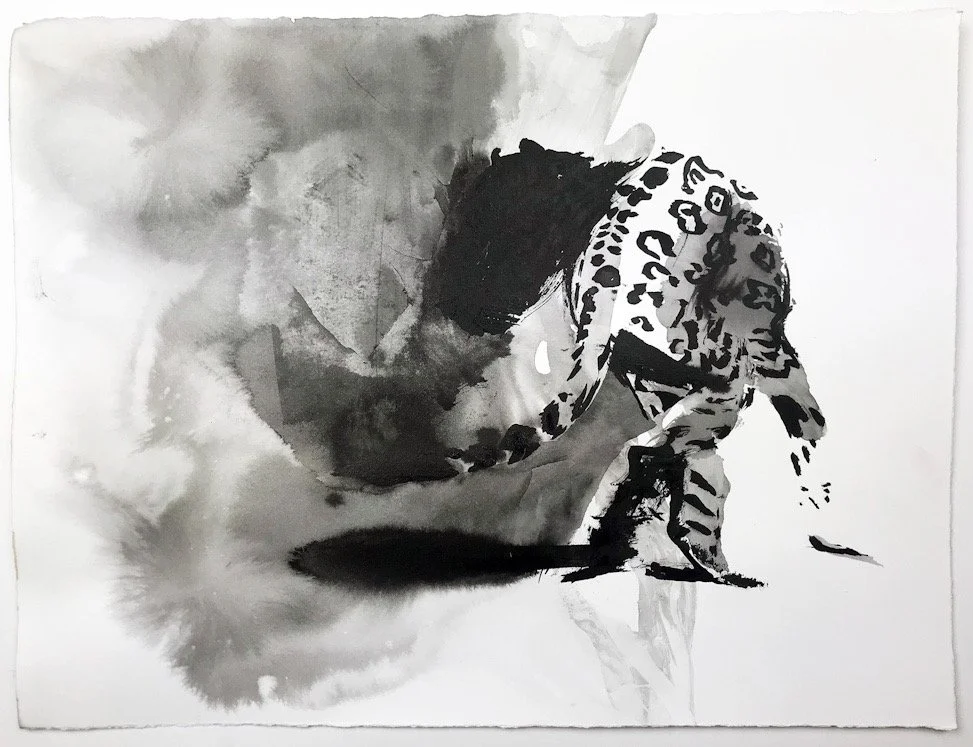 “Leopard turning” 2022, Sumi ink, watercolor paper, 15 x 11 in (38 x 28 cm)
