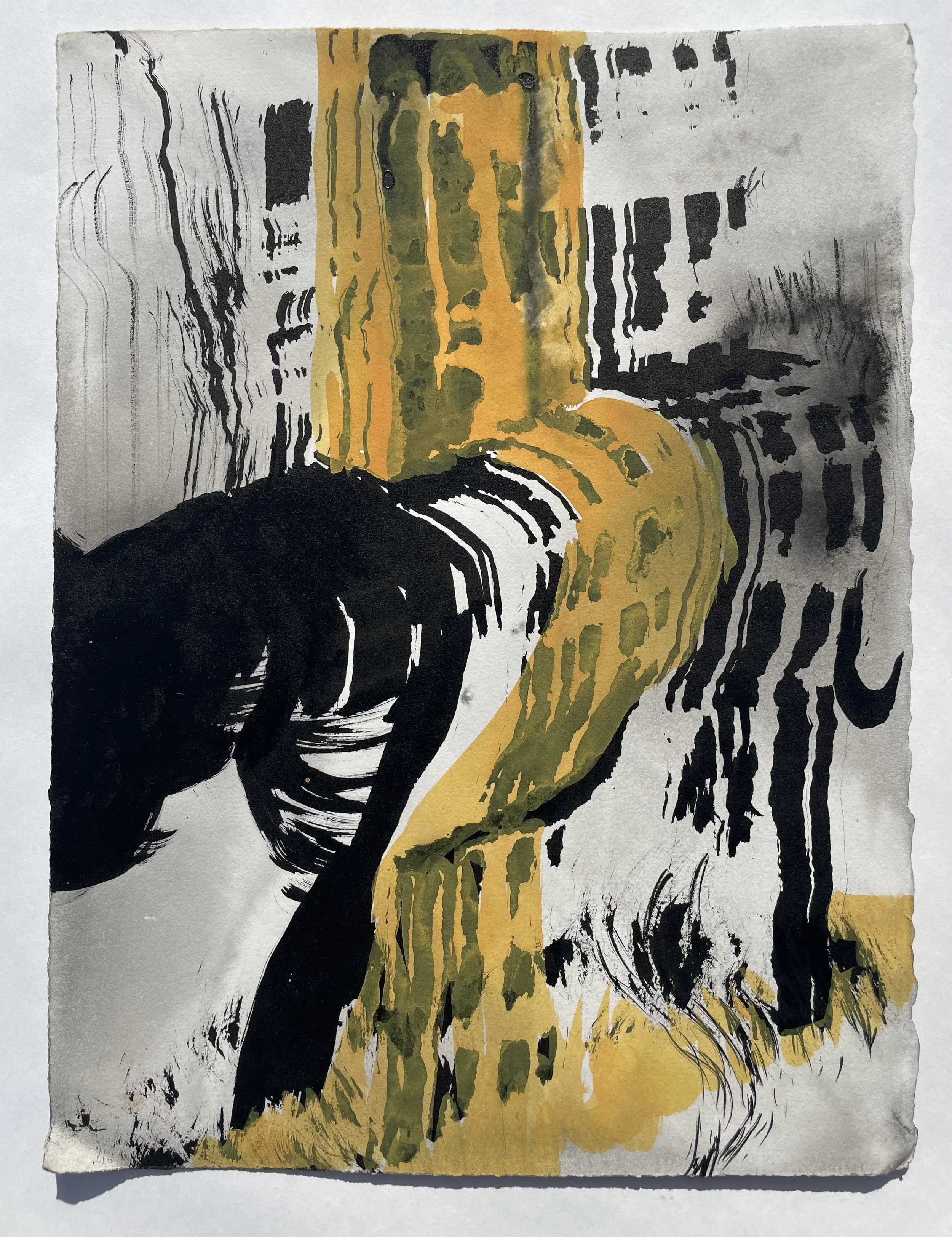 “Approach” 2021, Sumi ink, paint, watercolor paper, 15 x 11 in (38 x 28 cm)