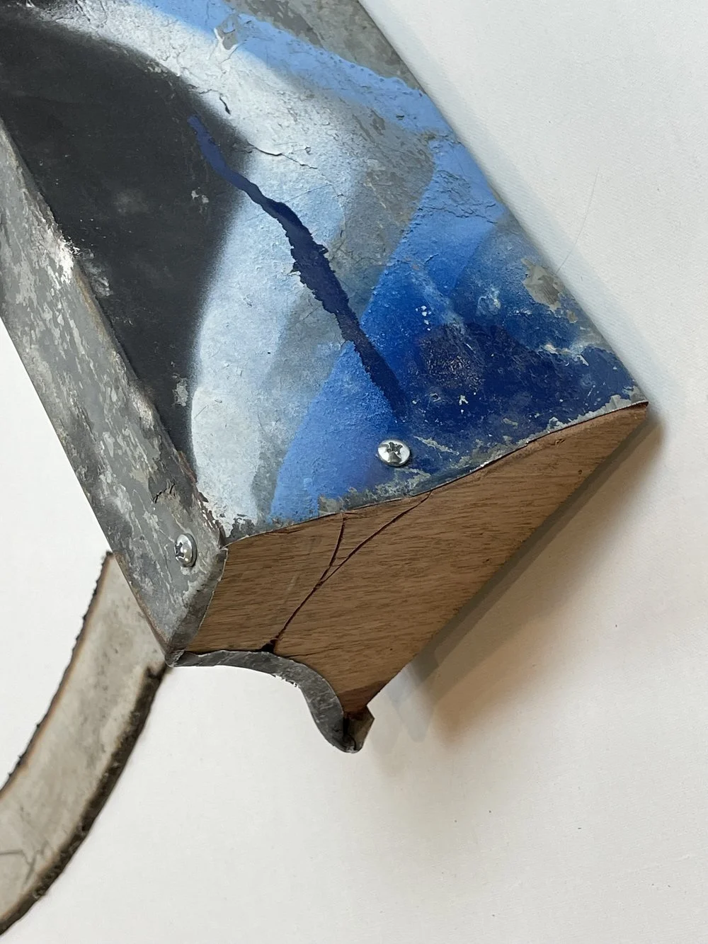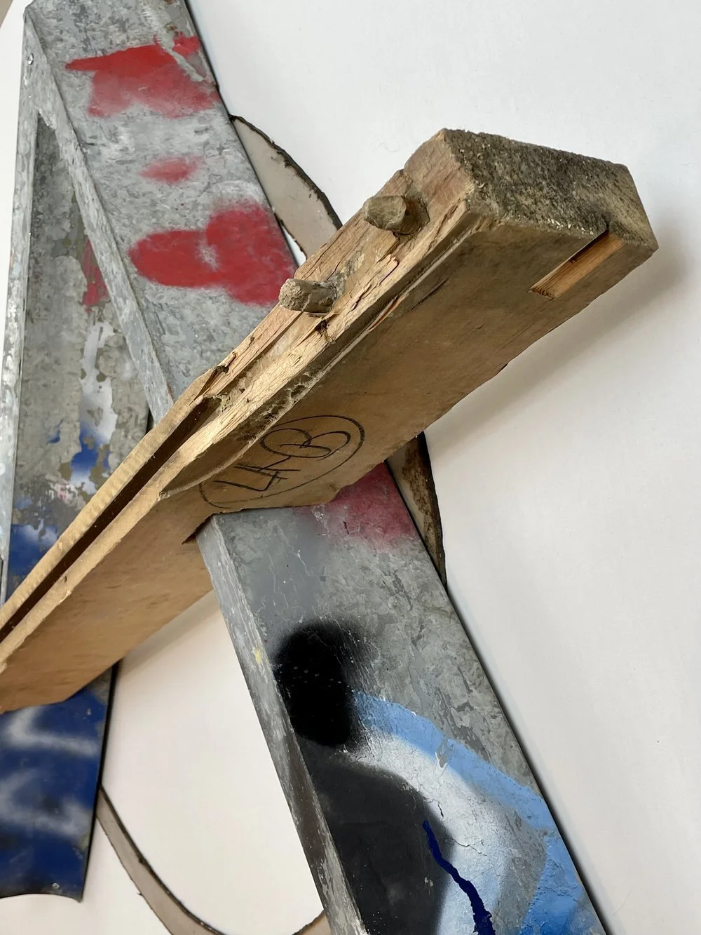 “Anarchy”, 2022, found materials: stainless steel circle, wood door jamb, galvanized metal with graffiti,