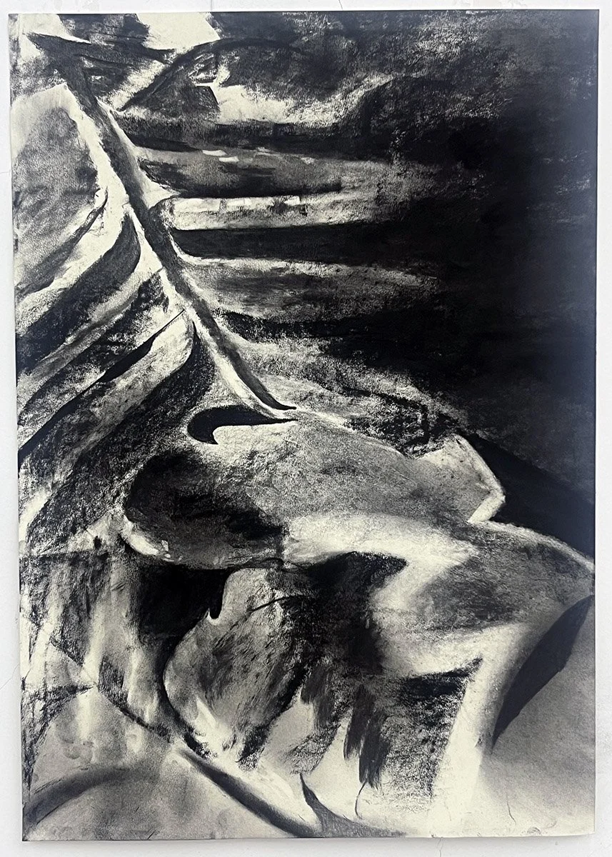 "Coal on Fire 2", 2025, compressed charcoal, paper, 75 x 53 cm (30 x 20 in)