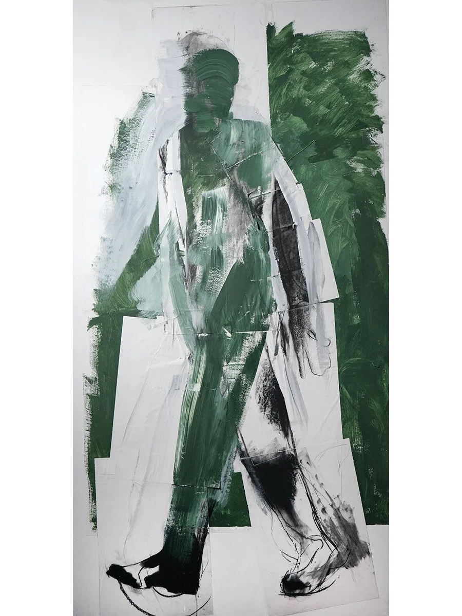 Green man, 2025, paint, charcoal, paper, wood panel, glue, tape, 83 x 42 x 1.5 in (210 x 109 x 4 cm)